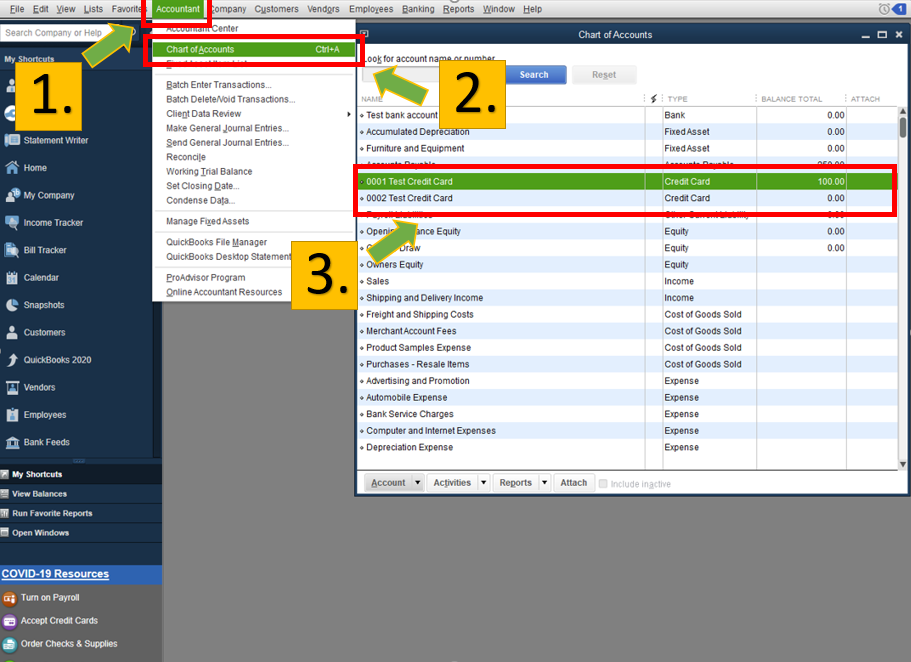 In QuickBooks Desktop products click Company then Chart of Accounts. Go to the bottom of the Bill Payments screen and locate the Method field. Enter individual credit card charges.